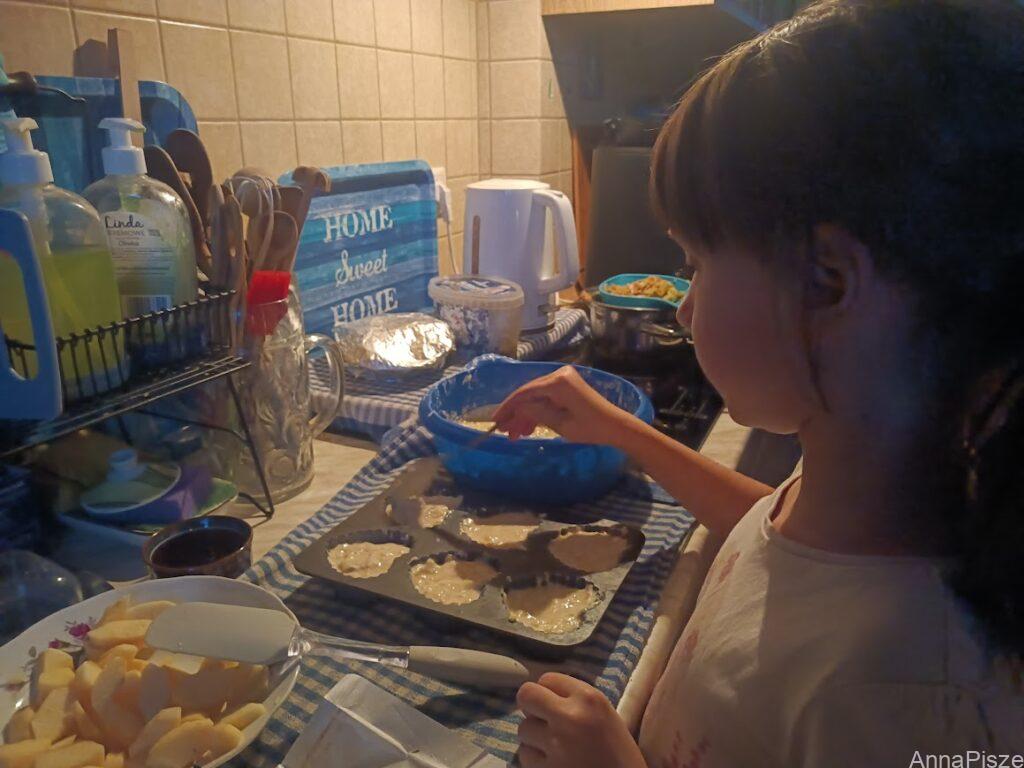 Calineczka piekła muffinki, sama wymyśliła, że mają być z czekoladą. Trzeba było uważać, żeby babcia D. nie dała Szilce.