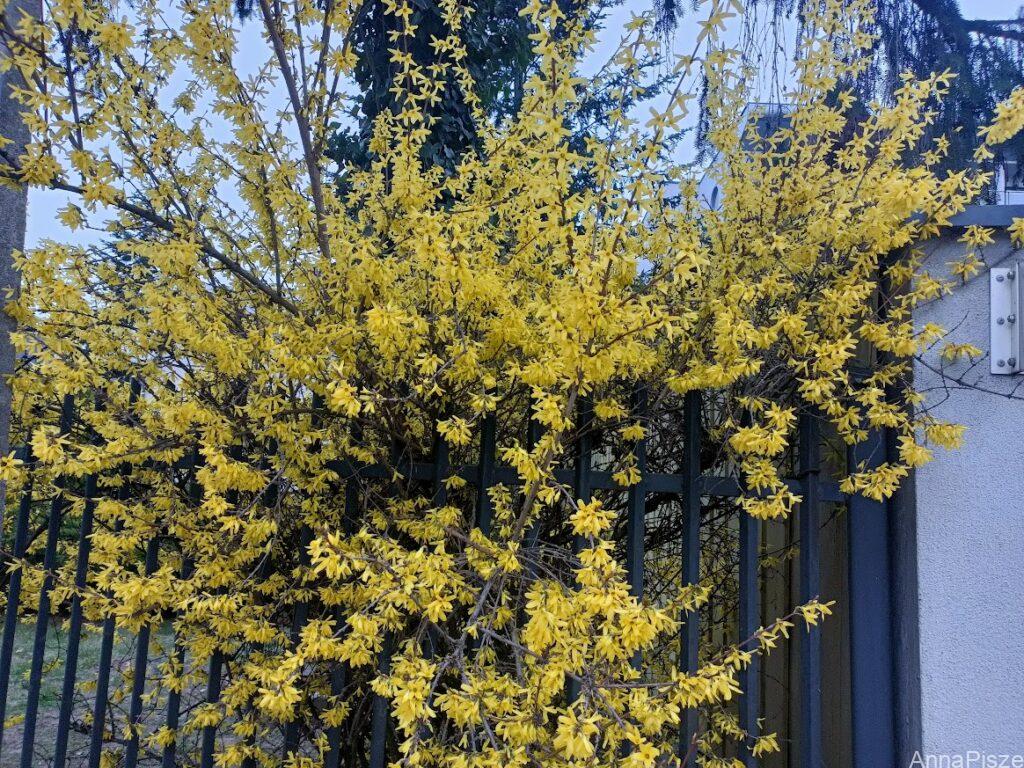 Wiosnę widzę idąc rano z Szilunią na spacer, wczoraj zdziwiłam się zobaczywszy rozkwitniętą forsycję.